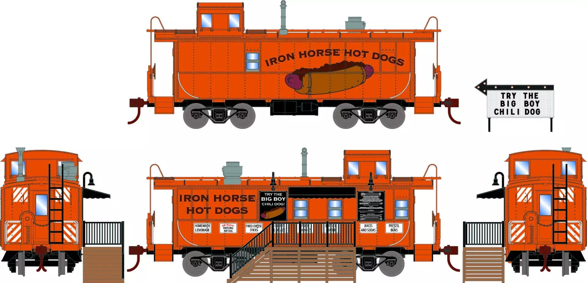 • Decorated menu boards • Stairs and platform for service through caboose side windows