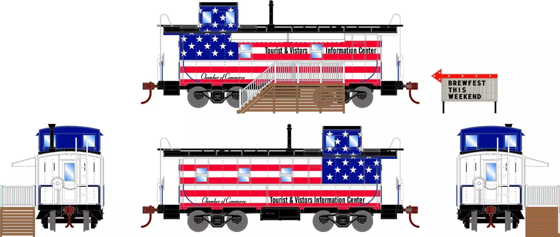 • Decorated menu boards • Stairs and platform for service through caboose side windows