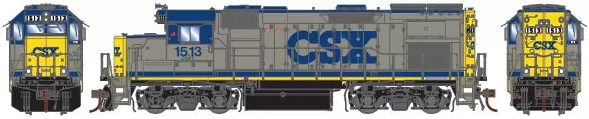 #1513 “Blue stripe” repaint with yellow ends and frame stripe, CSXT sub lettering, whip antenna, large front plow, crooked CSX lettering on right side