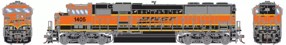 • #1405 Small EMD plow, “Skate” style antennas on the cab roof angles, front and rear ditch lights, brake wheel